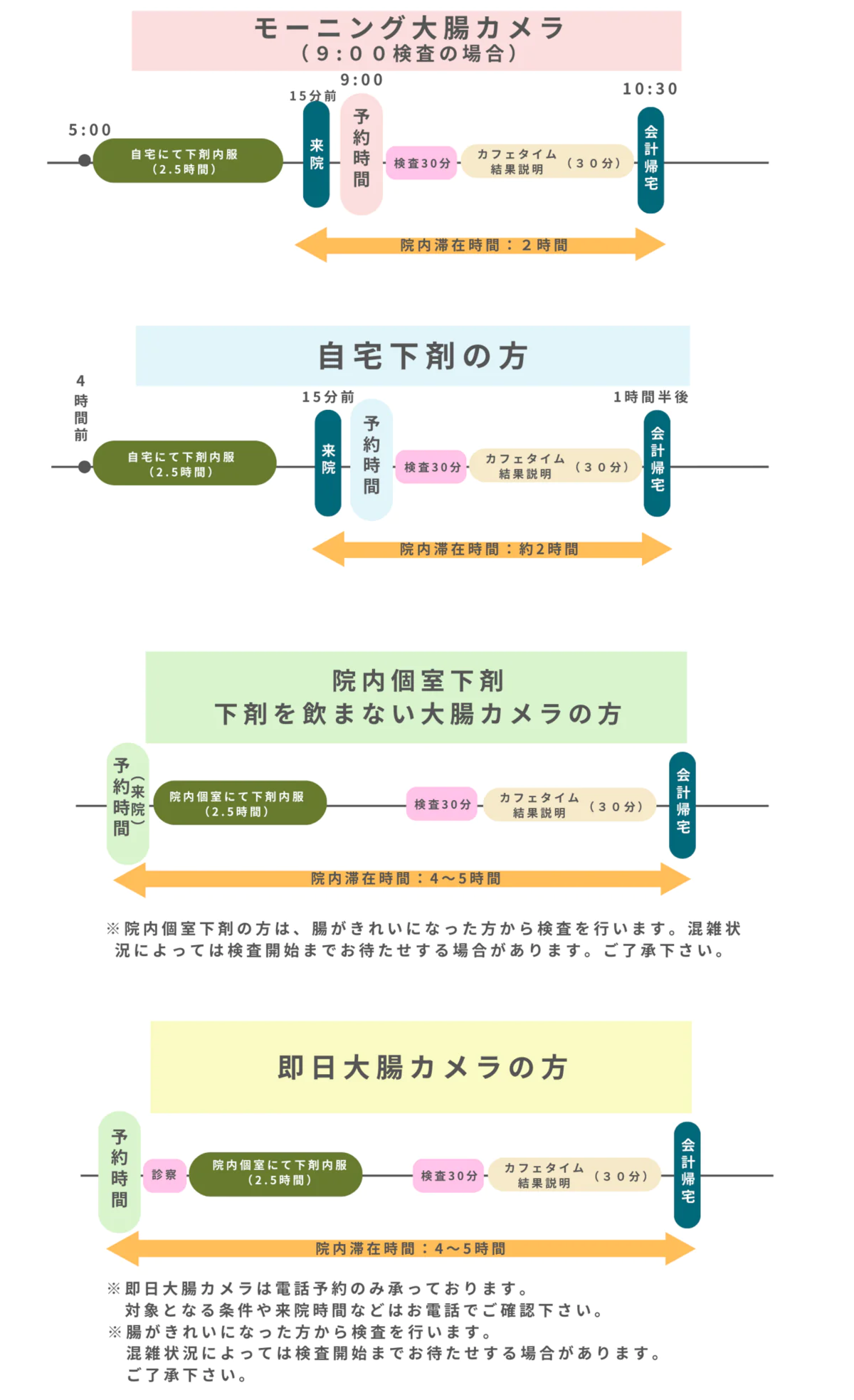 下剤を内服して腸がきれいになるまでの時間や、鎮静剤の効果が切れて覚醒までの時間は個人差があるため、お時間が前後することがございます。検査当日はゆとりをもったスケジュールでお願いいたします。